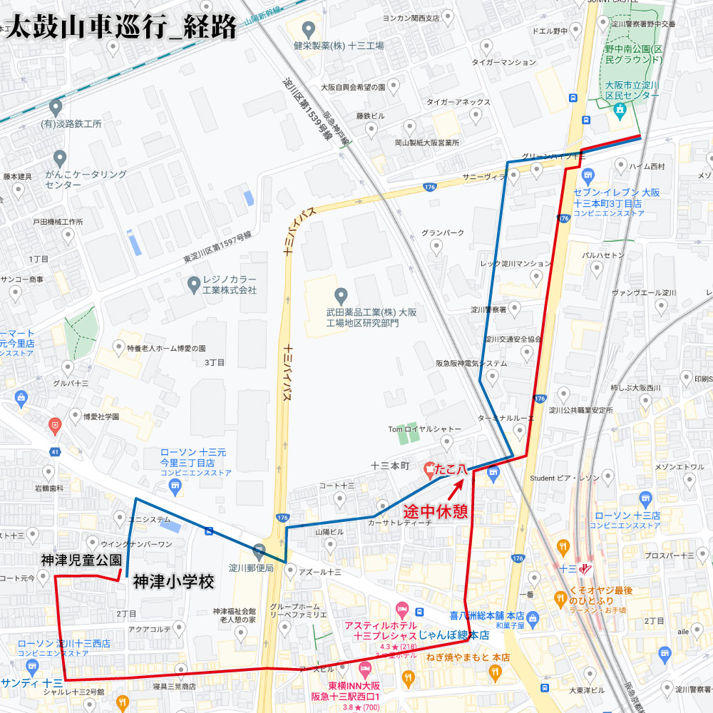 帰りの児童公園までは青の経路
